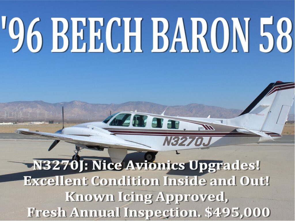 N3270J 1996 BEECH BARON 58 Courtesy Aircraft Sales $495,000 Call (815) 229-5112, or Email Us Below: (815) 229-5112 Contact Us Description Nice Avionics Upgrades! Excellent Condition Inside and Out! Airframe 4840 Hrs TTSNEW Engine(s) Continental, IO-550C 300-hpLH: 1470 Hrs on remanufactured engine RH: 1520 Hrs on remanufactured engine Avionics Aspen EFD 1000 PRO PFD with GPSS, Flight Director, Synthetic VisionGarmin GNS GTN-750 WAAS Global Positioning System/ Moving Map/Nav/CommTerrain and Obstacle Warning, Safe TaxiBendix/King KX-165 with KI-208 Vor/Loc IndicatorGarmin GTX-345 Transponder ADSB IN/OUTBendix/King KEA-346 EncoderBendix/King KMA-24 Audio/Marker Beacon and Remote Marker LightsBendix/King KFC-200 (Three-Axis) Autopilot/ Flight DirectorBendix/King Yaw DamperBendix RDR-2000 Color Weather RadarPS Engineering PM-3000 Intercom, 6 place, Stereo inputArtex 406 ELTBeech Yoke mounted Chronometer Propeller(s) Hartzell three blade propellers LH: 220 Hrs SPOH RH: 76 Hrs SPOH Remarks Equipment Keith Electric Air ConditioningKnown Icing ApprovedJPI EDM-760 Engine Monitor with fuel floPropeller synchronizerHeated pitot/stall warningFlight hour recorderDual Tachometer with syncRotating Beacon-topSteerable nose wheel taxi lightExternal power receptacleAlternate static airCleveland wheels and brakes(2) 100 amp alternatorsOxygen SystemCo-pilot brakesRudder and Aileron TrimRosen VisorsPilot Vent WindowWhelen StrobePrecise Flight PulselitesBrackett Air Filter Miscellaneous Annual Inspection Completed September 2025166 Gallon Fuel capacityUseful Load 1463 pounds Exterior Matterhorn White with Metallic Taupe Gray Stripes with Chestnut and Chocolate Accents, excellent condition Interior 6 place Taupe leather seats, Sheepskin cover- pilot and co-pilot, Tan wool carpet, club seating arrangement, executive writing table, excellent condition Aircraft is located in Mojave, CA. SPECIFICATIONS SUBJECT TO VERIFICATION UPON INSPECTION. PRIOR SALE AND/OR REMOVAL FROM THE MARKET WITHOUT NOTICE. Inquire Today Regarding This Aircraft This aircraft is currently available for purchase. If you’re interested, don’t delay. (815) 229-5112 ASK A QUESTION